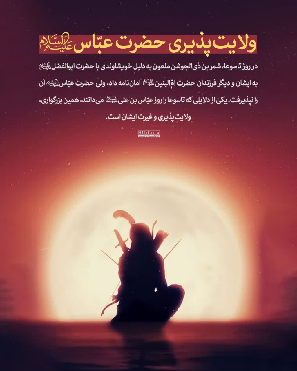 ✍️ یکی از دلایلی که تاسوعا را روز عبّاس بن علی علیهماالسّلام میدانند، ولایتپذیری و غیرت ایشان است.